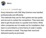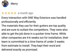 One Way Exteriors was founded by Colin and Megan DeHaan in February of 2016. Colin had worked in the building supply industry and saw a need for a seamless gutter company in his hometown. It grew very quickly in that original location.